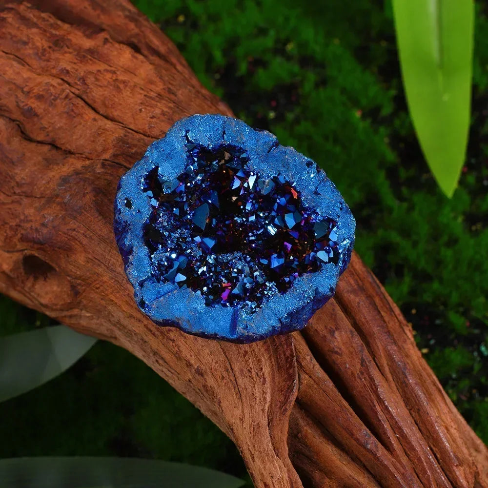 Each piece is meticulously shaped by nature and enhanced through modern electroplating technology, revealing rainbow-like iridescence and a dazzling crystalline surface.