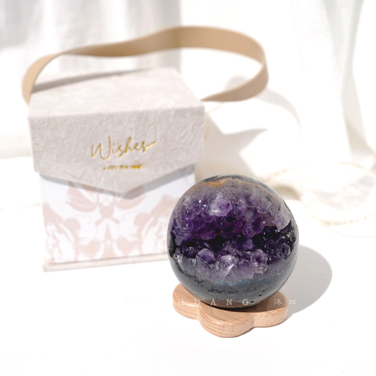 - Natural Uruguayan Amethyst Geode: Rare, unpolished amethyst geode in its raw, partially open spherical form, revealing stunning internal crystal clusters (known as “Kai Kou Xiao” or “Laughing Mouth”).